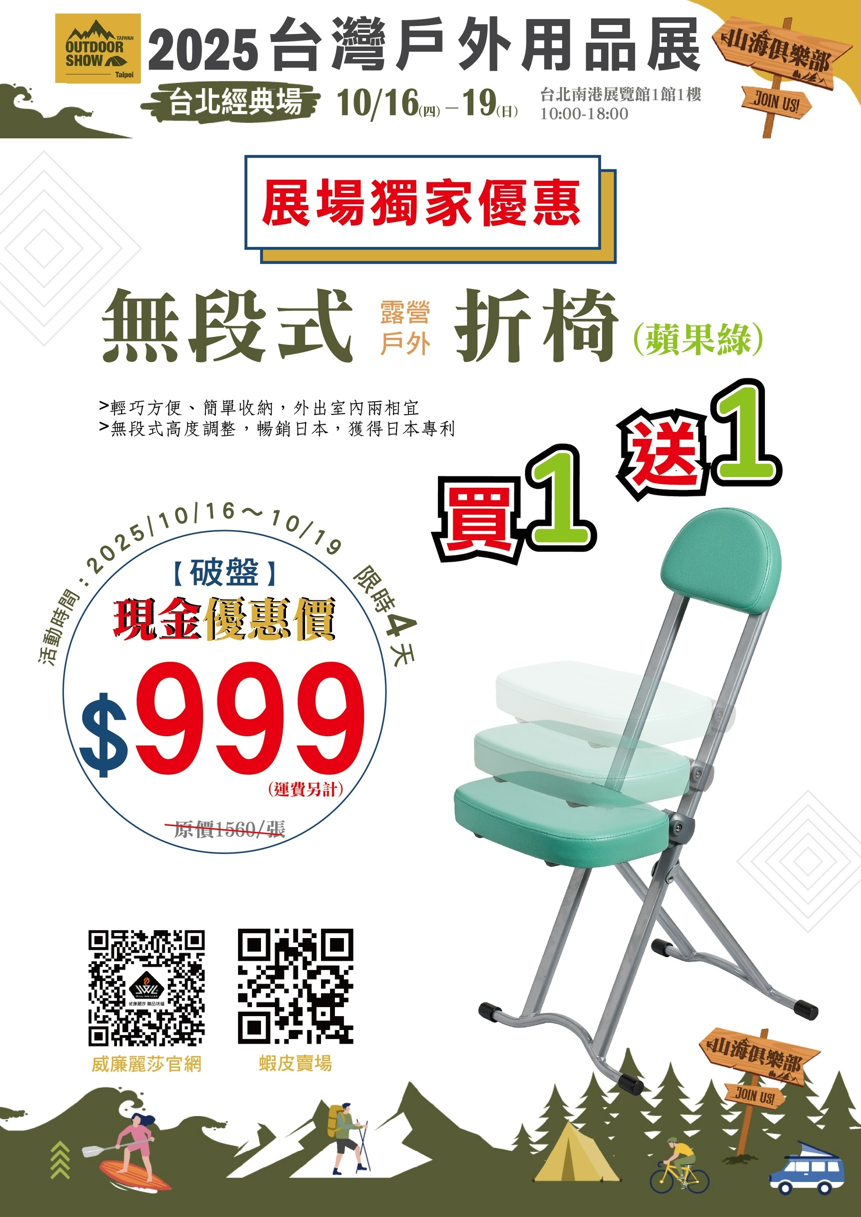 ►蘋果綠無段式折椅現金破盤價買一送一→ NT 999元(現場價) (原價 NT 1,560元/張)